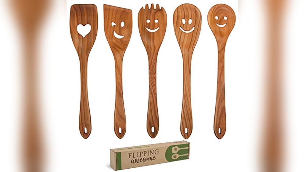 The MFC 5-Piece Wooden Cooking Spoons from natural cherry wood are ideal. They are sturdy, BPA-free, and safe for nonstick surfaces. Their smiley faces add a fun touch to cooking and serving.