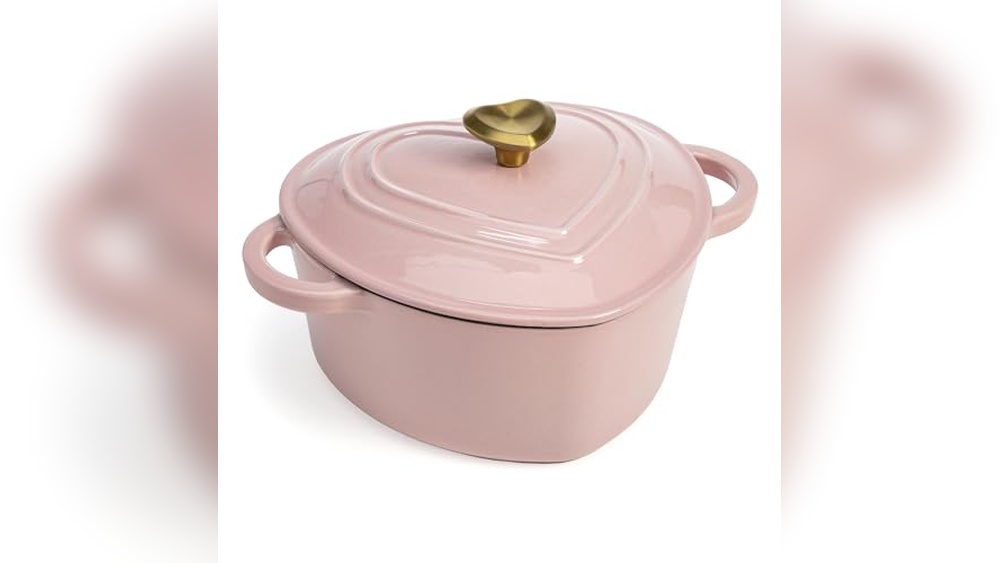 Paris Hilton’s Dutch Oven is heart-shaped and enameled for durability. It works on all stovetops and is oven safe up to 500°F. Its 2-quart size is perfect for small meals and adds a stylish touch to your kitchen.